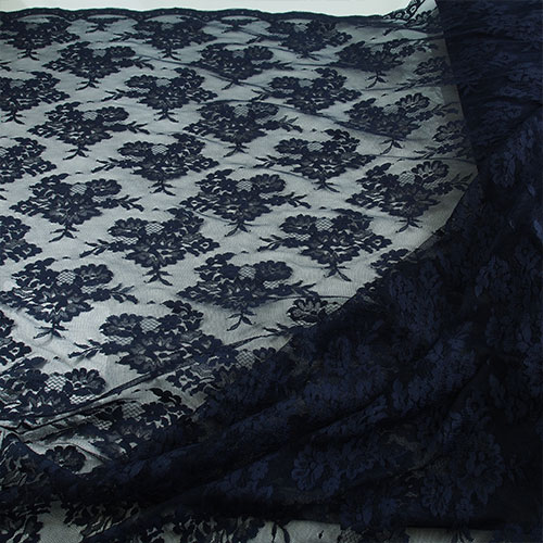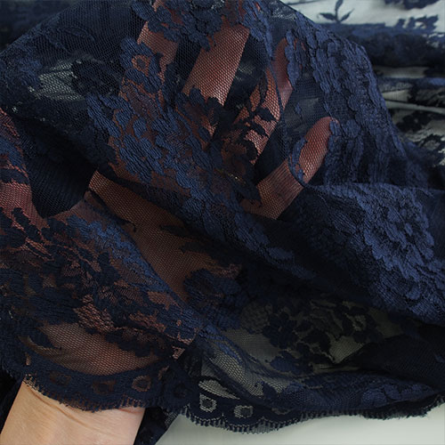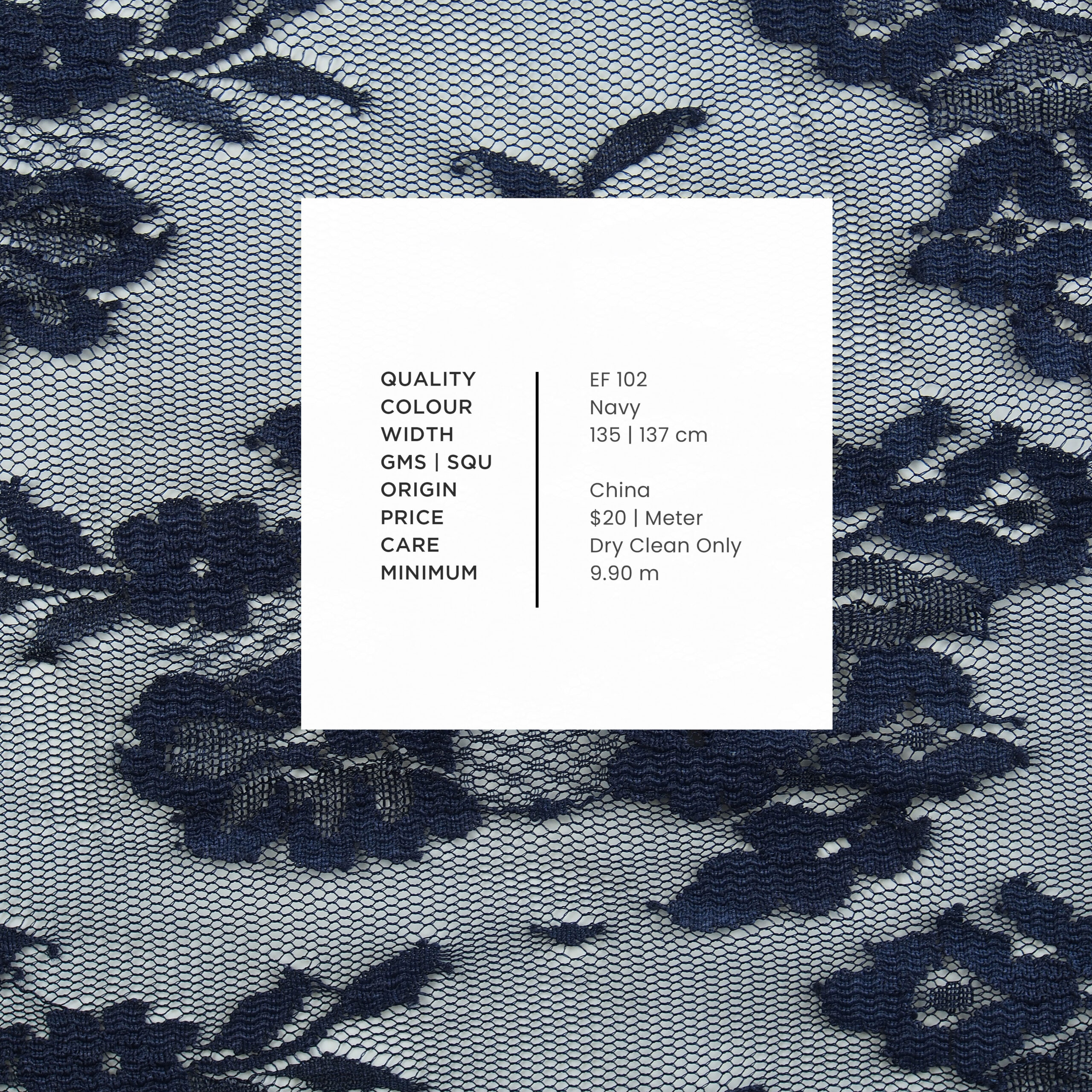Poly navy flower lace. Double-edge scallops both sides of the design. This lace has a slightly courser feel however still classified under a fine lace description.